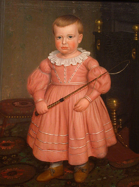Moving into the 19th Century, red was a common color for men of this period, and boys thus wore pink. Think about the laundering process from this time- anything red would quickly fade to pink with the boiling water, harsh soaps and hand scrubbing; anything white would pick it up! There are two paintings from this period that stand out to me- both showing young boys wearing pink as a matter of course. The first is Queen Victoria sitting with Prince Albert (image sourced from Wikipedia, but I couldn’t find any additional information); the second is an American Boy Holding a Whip (Anonymous Artist, circa 1840). To clarify, most children wore dresses well past toddlerhood into the early 20th century, and pink was far more likely to be chosen for boys than it was for girls since it is a much “stronger” color as a relative to red.