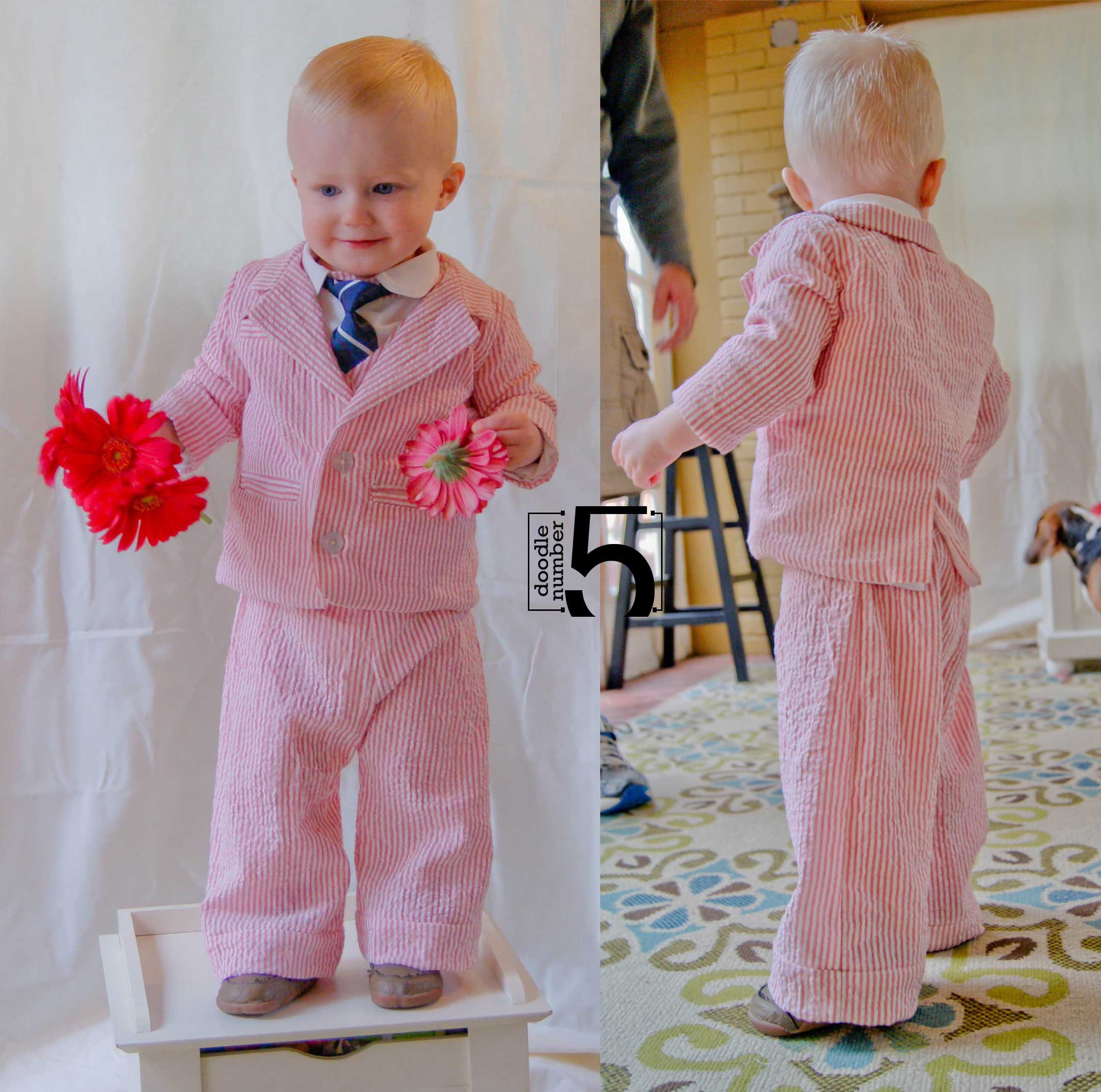 The main fabric for the pants, vest, and jacket is a dark pink/white stripe on seersucker, and I lined with a dual-faced polyester I had left over from Lil Foxes baby blessing outfit that is satin on one side, slubbed on the other. I couldn’t find any solid pink in the tone I was looking for- the closest was an upholstery velvet. That would have taken us to entirely the wrong era! The necktie was repurposed from one of Daddy’s, and the shirt was medium-weight white cotton/ poly blend shirting fabric I’ve had for a while. It’s butter soft, irons beautifully and has just the tiniest bit of stretch on the bias. It was very easy to work with, and I was glad to get it moved out of my stash because it did have some flaws and I needed a pattern small enough to work around the minor stains and holes in the fabric. Overall, I’m really happy with how this turned out, even if it’s just a bit more Fred Astaire than Robert Redford. I’m hoping it all still fits in a few months so it can also be his Easter suit. It’s also a sure winner for Oscar’s night.