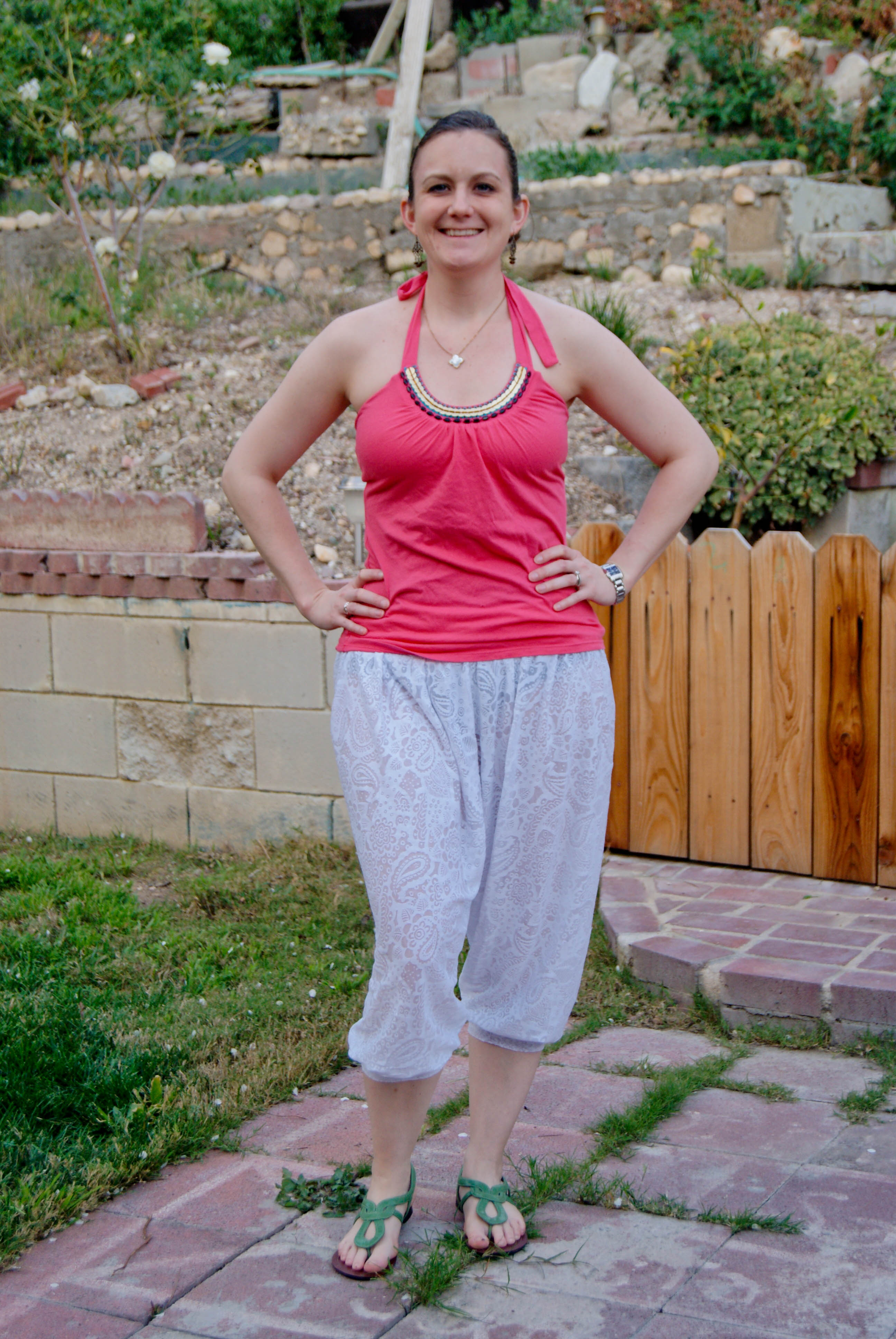 The pattern is by Everything Your Mama Made & More, called the Women’s Freestyle Harem Pants & Capris (Misses XS-5X). There is a coordinating pattern for kids, sized NB-18, which I think is awesome. Here’s the rundown on my experience with the pattern: