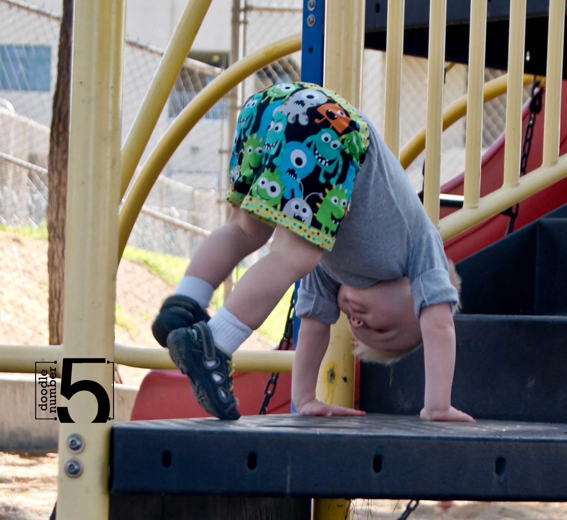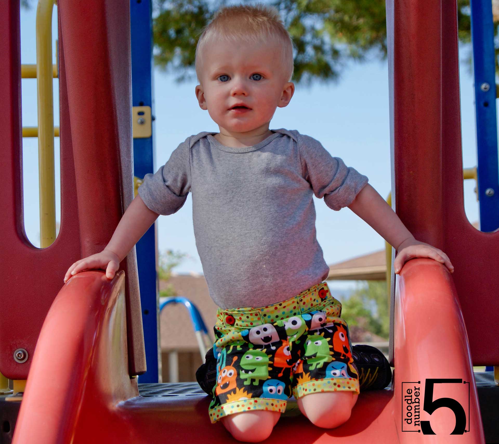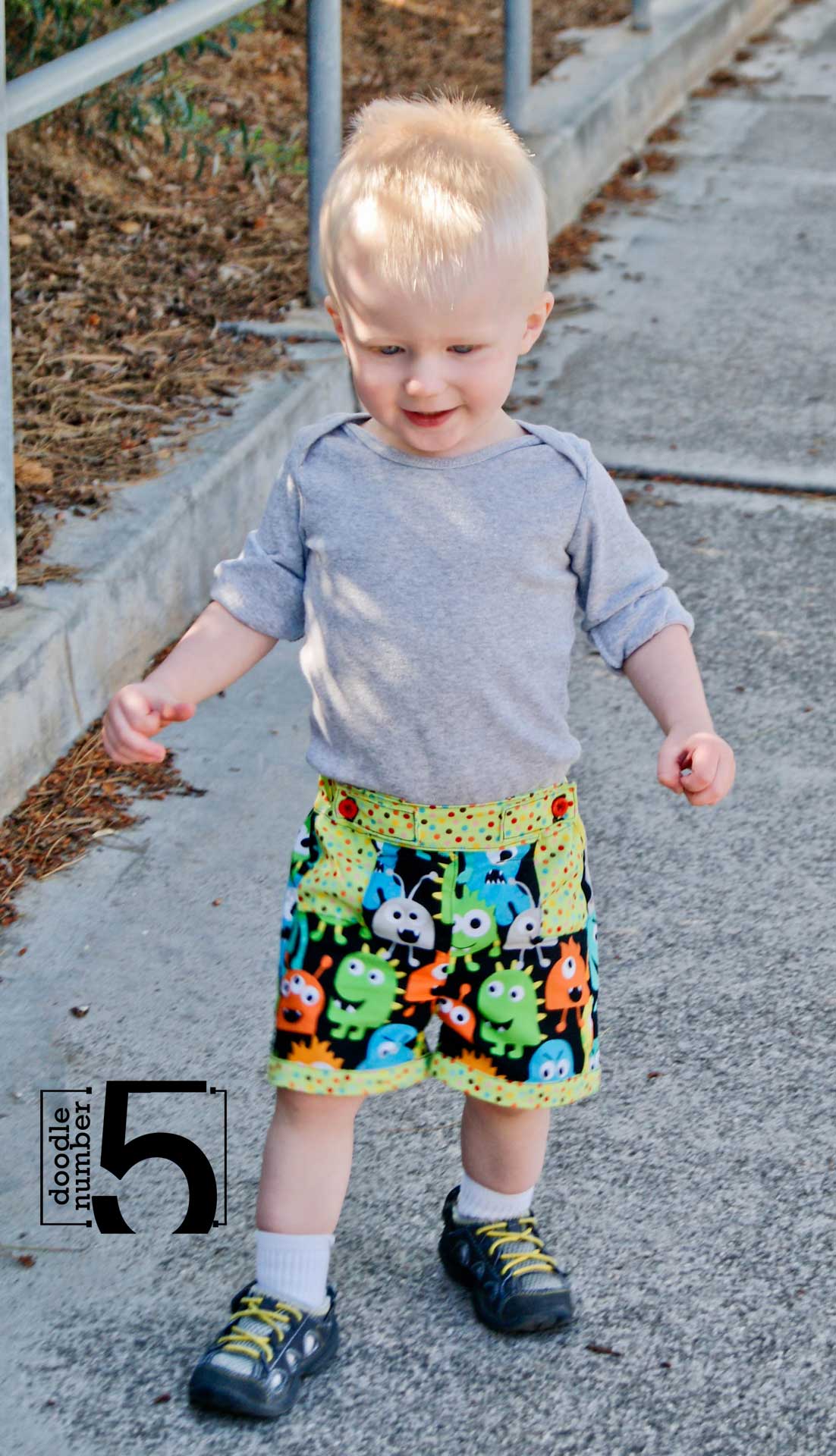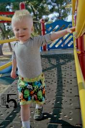 With all the details, they weren’t my quickest sew ever, taking about 3-4 hours from start to finish. But the instructions are very well written and easy to follow. An adventurous beginning sewist can certainly complete these shorts with no problems. The most important thing, however, is how much my son loves these shorts! We took them for a walk and they totally passed the Playground Test – the 1″ elastic in the back stays put, no matter what Lil Fox put them through. These are the 18m/1 size and I found them perfectly sized based on the measurements provided in the pattern.