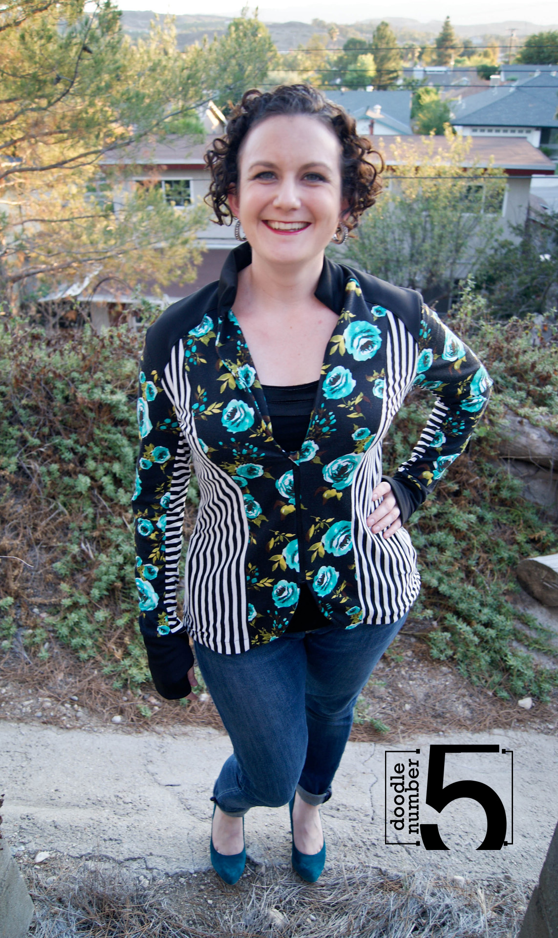 For a quick minute, I thought I was done with this pattern – I made my muslin, made my final version and managed to get some cute pictures too (big, huge thanks to my friend Emma for stepping up to be my awesome photographer!) But one of the other testers made a gorgeous jacket using stripes and florals and I couldn’t get it out of my head. I just ordered a couple of amazing floral ponte de roma knits and I knew one of them would be perfect for this jacket. The side stripes are vertical for a couple of reasons – obviously one is to make me look skinny lol. The other is that it was almost impossible to match horizontal stripes front to back because of the curves along the side seam. To me, floral = feminine so I wanted to make the pleated back on this one. I also saw a picture of similar jacket that had a contrasting underarm panel, so I wanted to try that out. Finally, I figured while I’m hacking the pattern I’ll try shortening the front zipper (to 8 1/2″) to start just under my bust, curve the center front below the zipper, and since the floral is so pretty, I cut the back on the fold rather than piecing it to keep the print all together. That’s a lot of modifications, but none that are terribly complicated. I am totally in love with how it turned out.