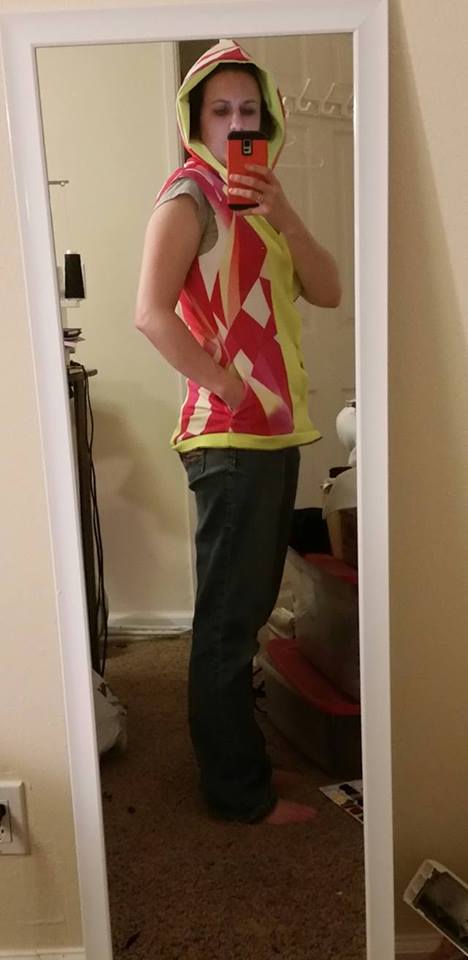 One more hack is planned- I’m going to try cutting the front panels on the fold, make a v-neck, and add a kangaroo pocket to the front. It will be a pullover hoodie rather than a zip-up jacket. We’ll see how that turns out.