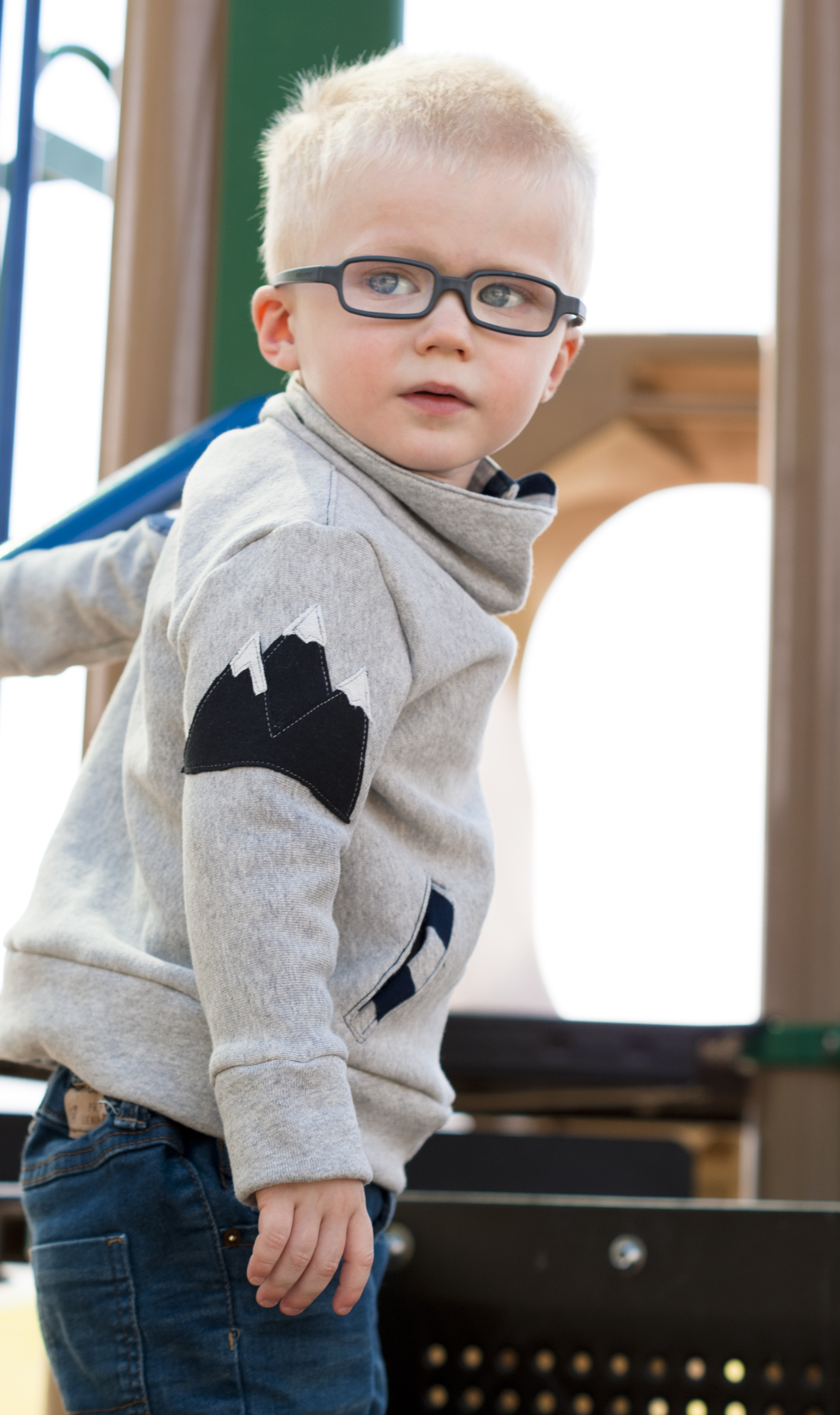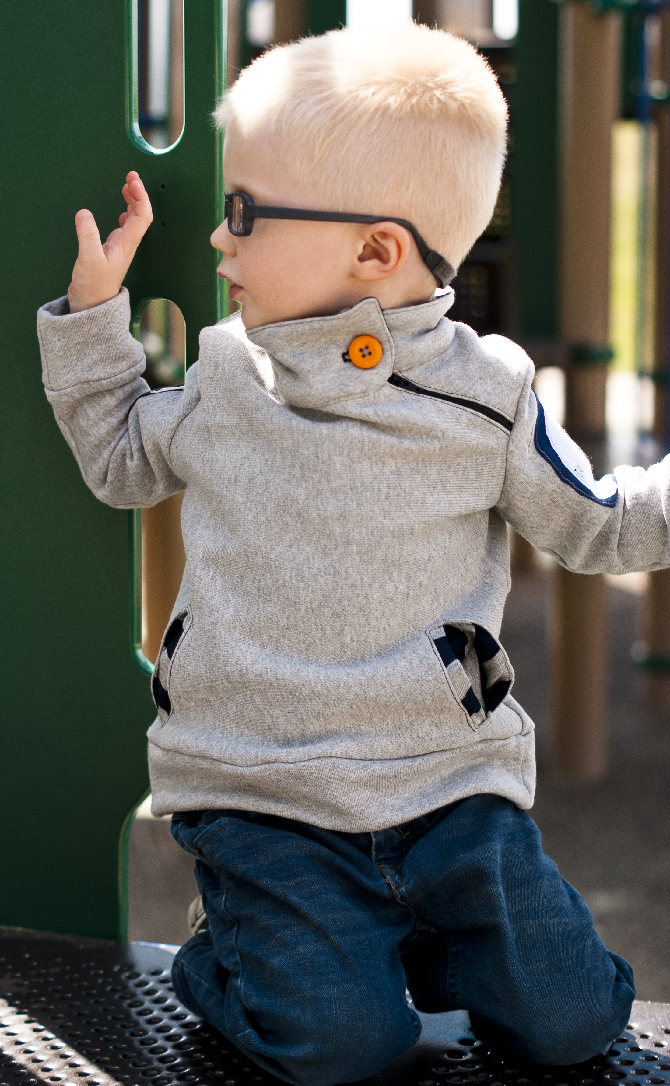 - 18m size in grey stretch sweatshirt fleece from PurpleSeamstress. I muslined a version using non-stretch sweatshirt fleece from JoAnn’s and I could BARELY get it over his head. The stretch was definitely preferable for this size