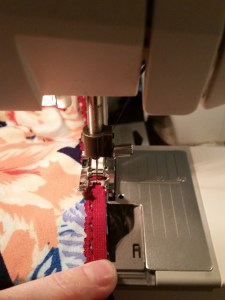 5. Once the elastic is basted on, flip that seam allowance over to the wrong side and use a narrow zig-zag stitch to keep it down. Again, go all the way around and only stretch enough to keep your DBP free of any tucks or gathers. The zigzag stitch will stretch with you as you wear it.