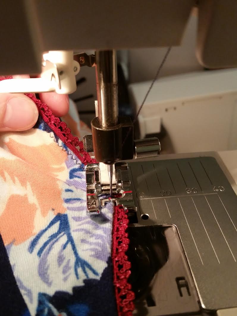 5. Once the elastic is basted on, flip that seam allowance over to the wrong side and use a narrow zig-zag stitch to keep it down. Again, go all the way around and only stretch enough to keep your DBP free of any tucks or gathers. The zigzag stitch will stretch with you as you wear it.